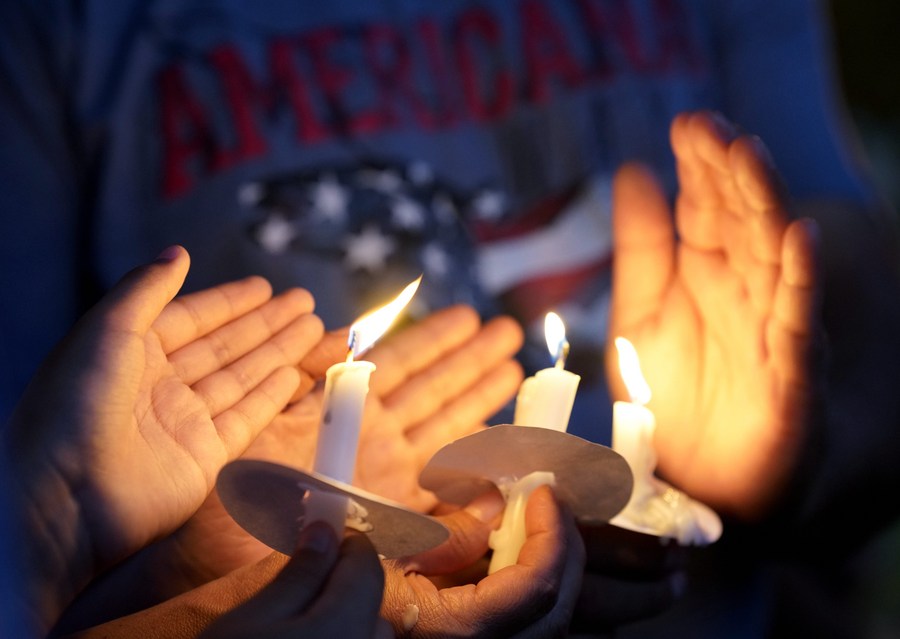 Candles are lit during a vigil to mourn for victims of a school mass shooting at Town Square in Uvalde, Texas, the United States, May 29, 2022. (Xinhua/Wu Xiaoling)