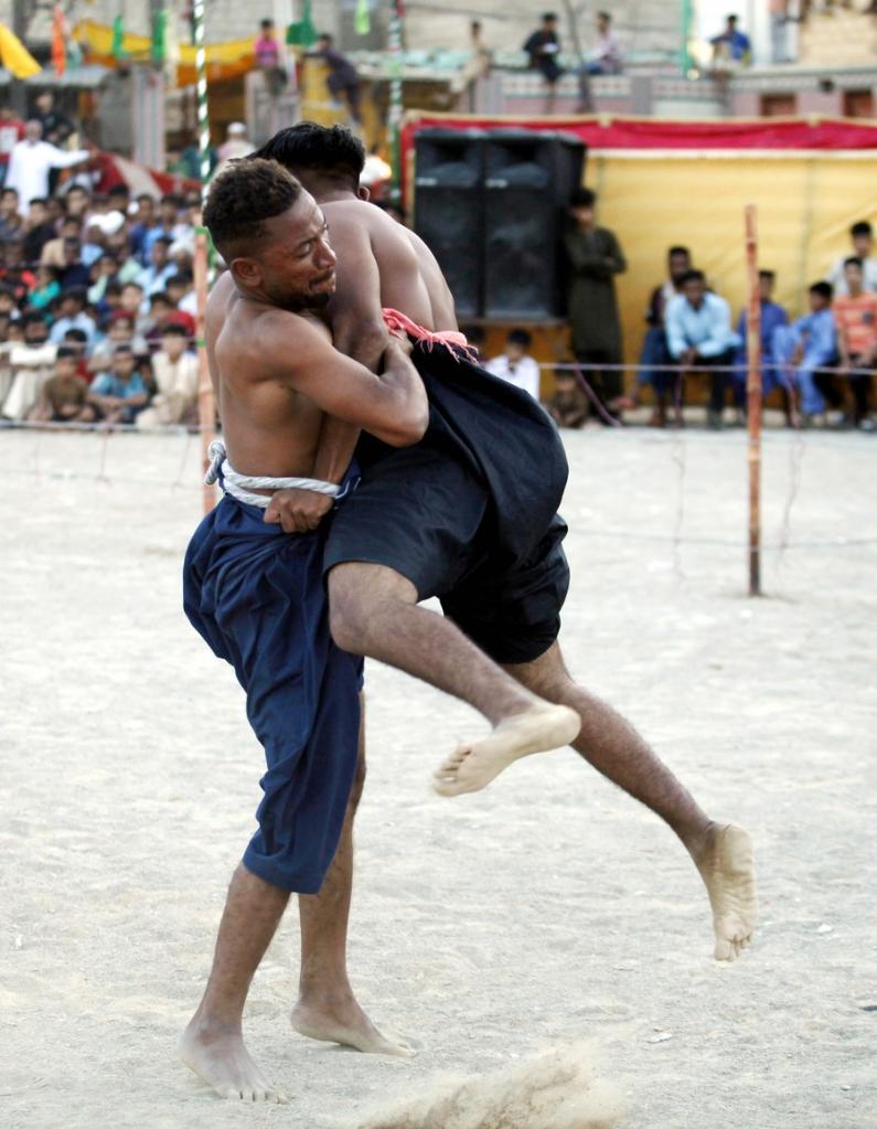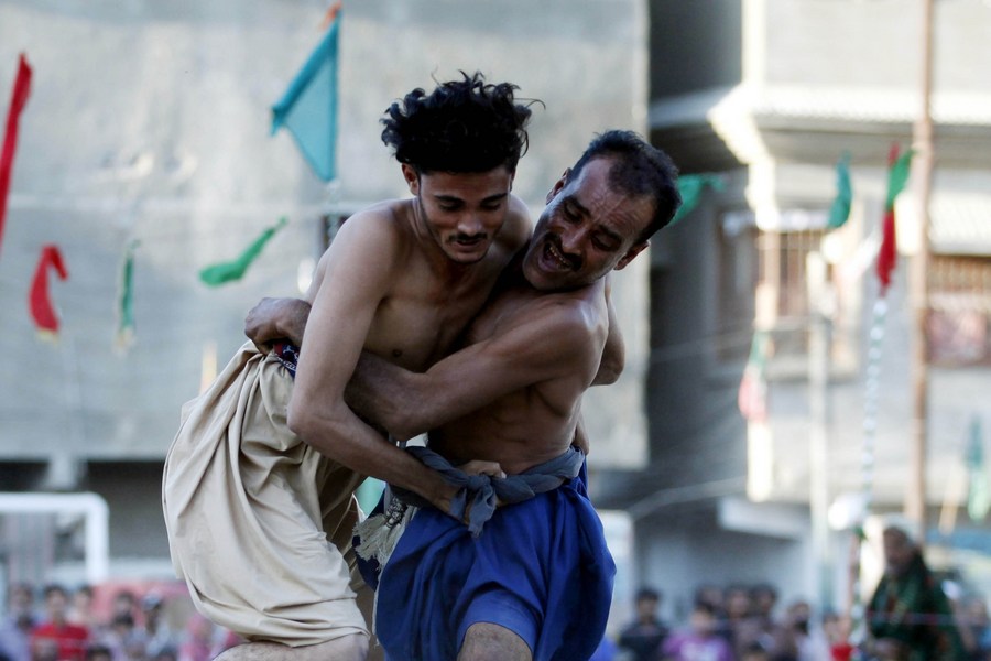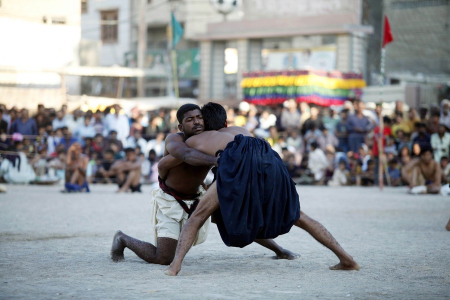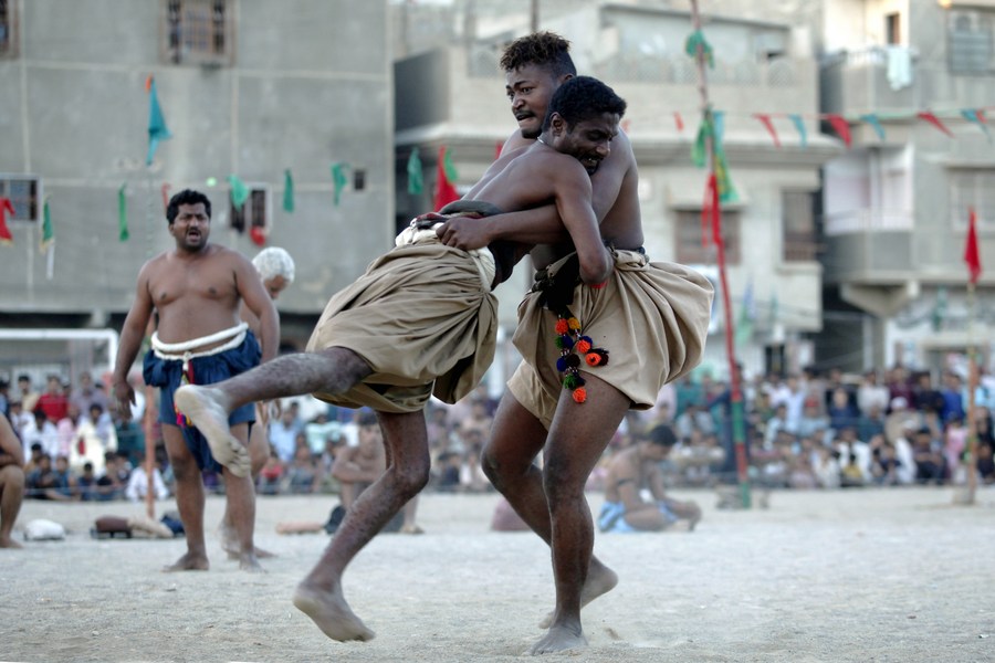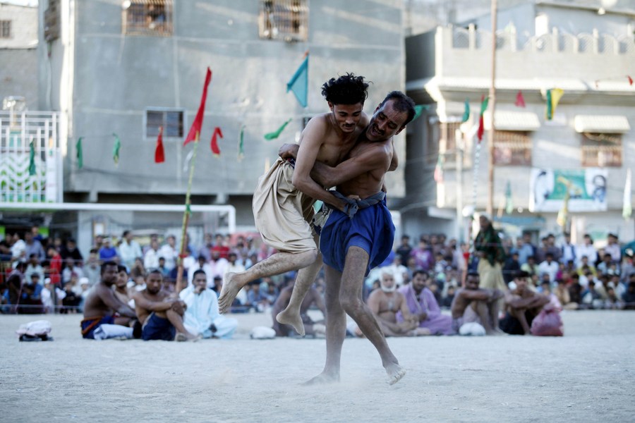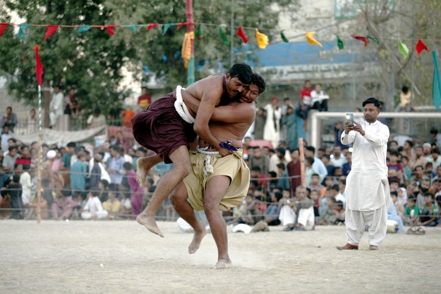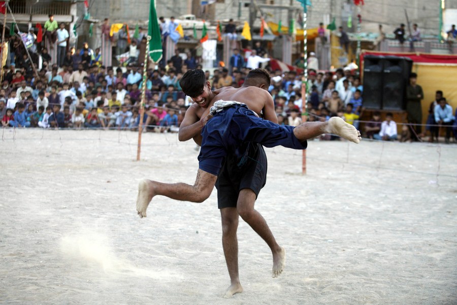 Wrestlers compete during a traditional Sindhi Malakhra wrestling at a local tournament in southern Karachi, Pakistan, on Nov. 24, 2022. (Str/Xinhua)