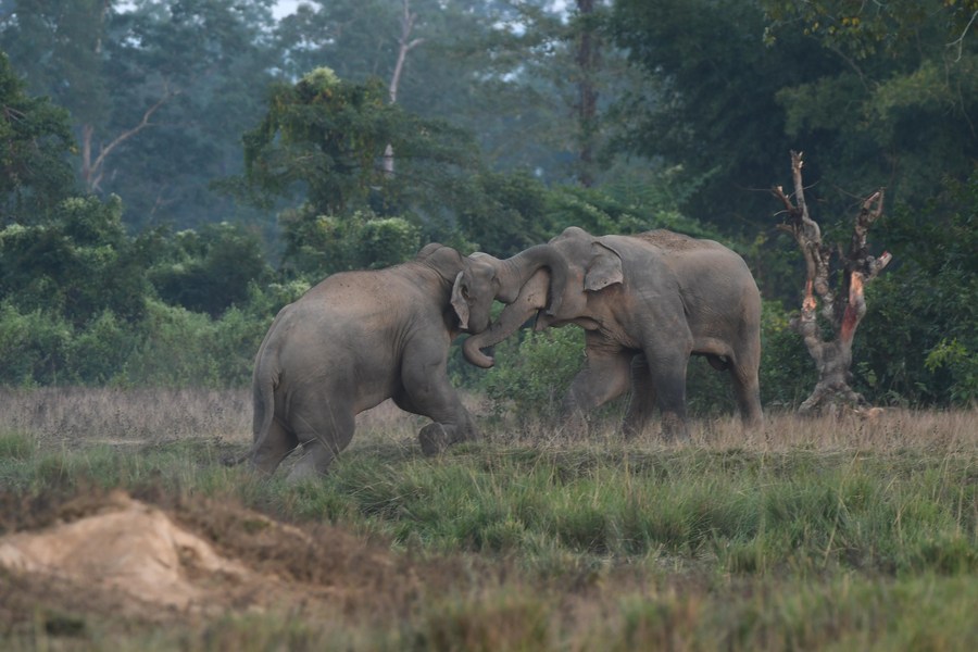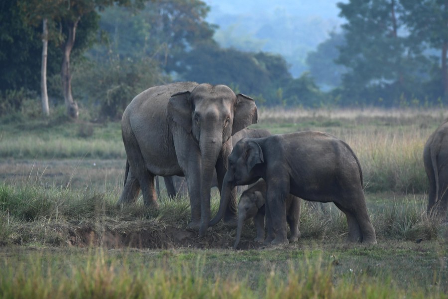 Photo shows wild elephants foraging in India's northeastern state of Assam, Nov. 25, 2022. (Str/Xinhua)