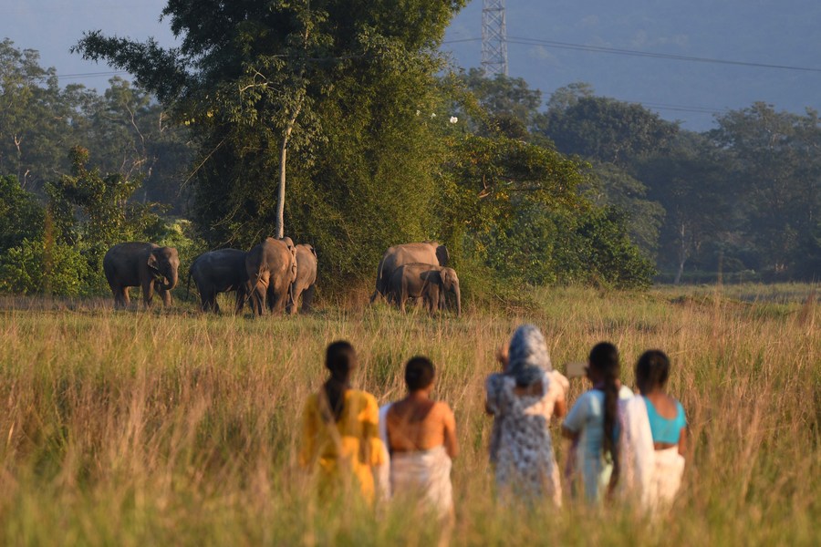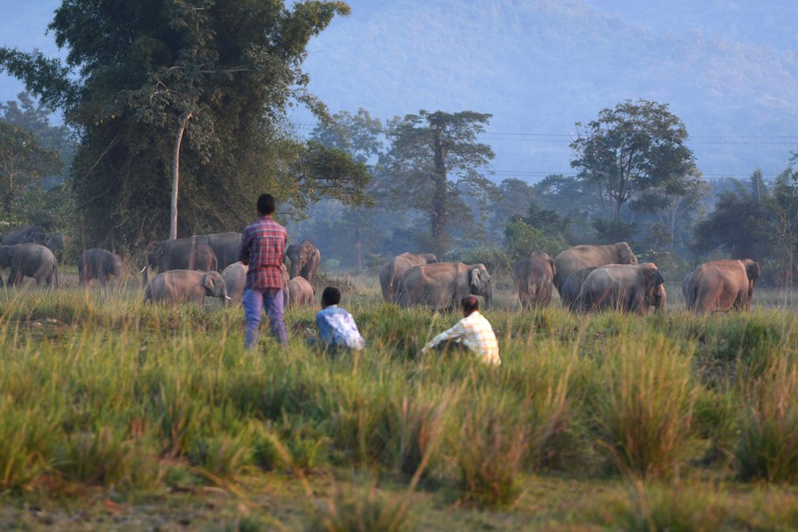 Villagers look at wild elephants foraging near a village in India's northeastern state of Assam, Nov. 25, 2022. (Str/Xinhua)
