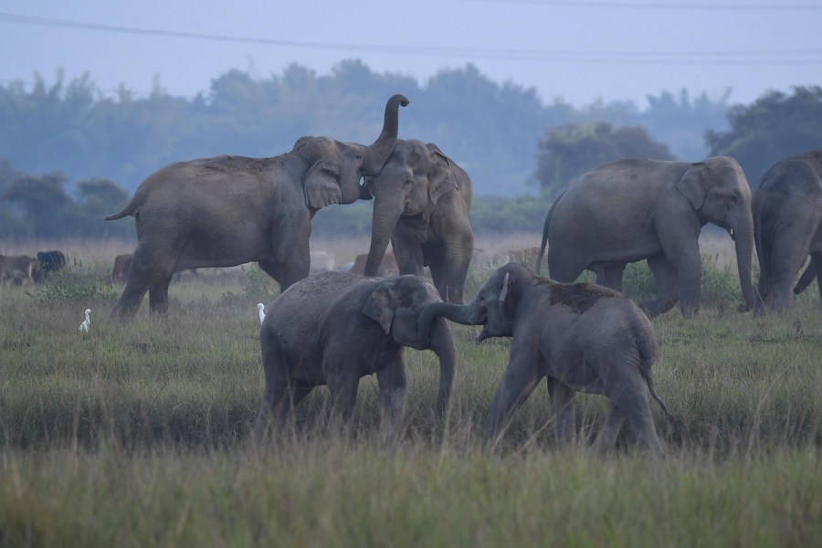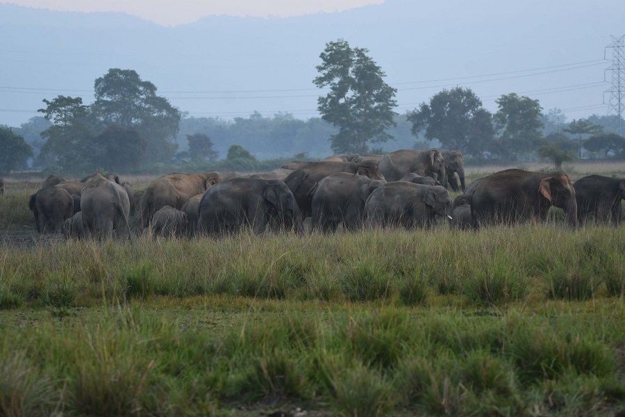 Wild elephants stray in fields in India's northeastern state of Assam, Nov. 25, 2022. (Str/Xinhua)
