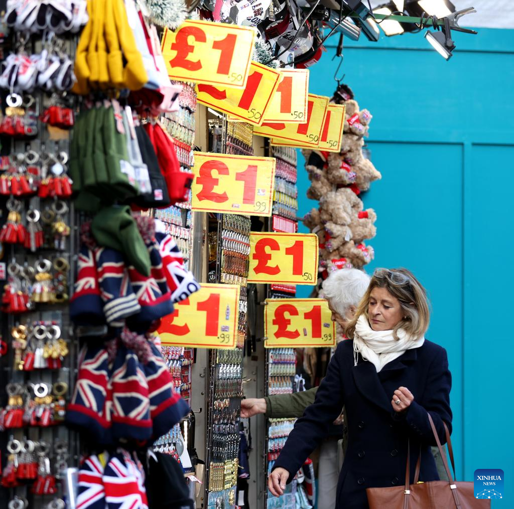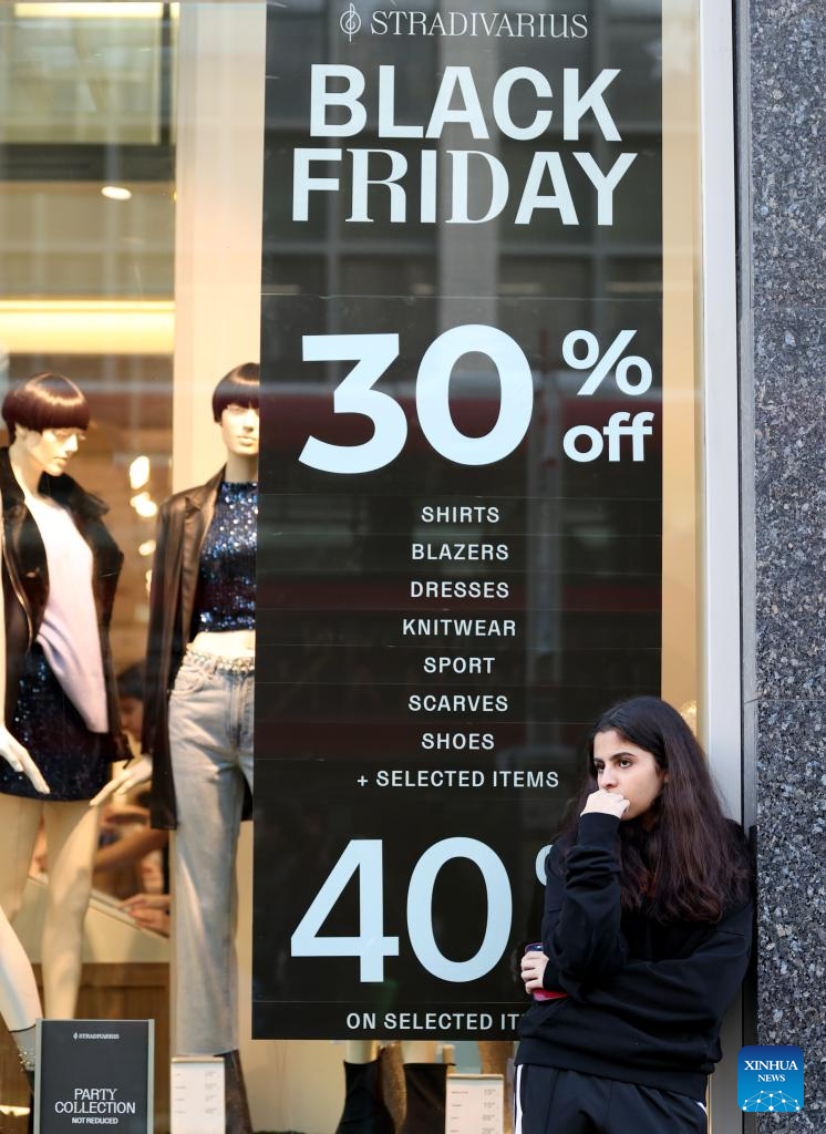 A shopper walks in Oxford Street during Black Friday sales in London, Britain, Nov. 25, 2022. (Xinhua/Li Ying)