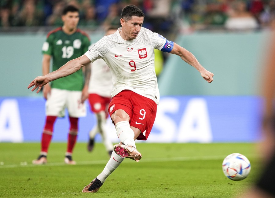 Robert Lewandowski (front) of Poland shoots during the Group C against Mexico at the 2022 FIFA World Cup at Ras Abu Aboud (974) Stadium in Doha, Qatar, Nov. 22, 2022. (Xinhua/Li Gang)