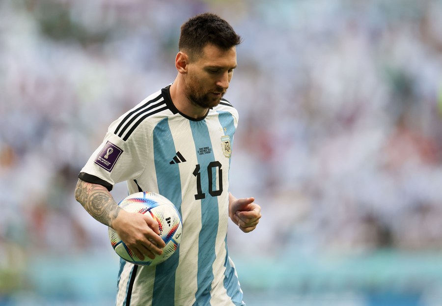 Lionel Messi of Argentina reacts during the Group C match against Saudi Arabia at the 2022 FIFA World Cup at Lusail Stadium in Lusail, Qatar, Nov. 22, 2022. (Xinhua/Cao Can)