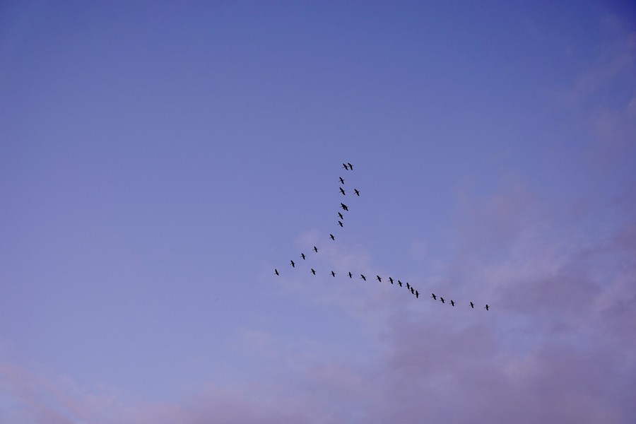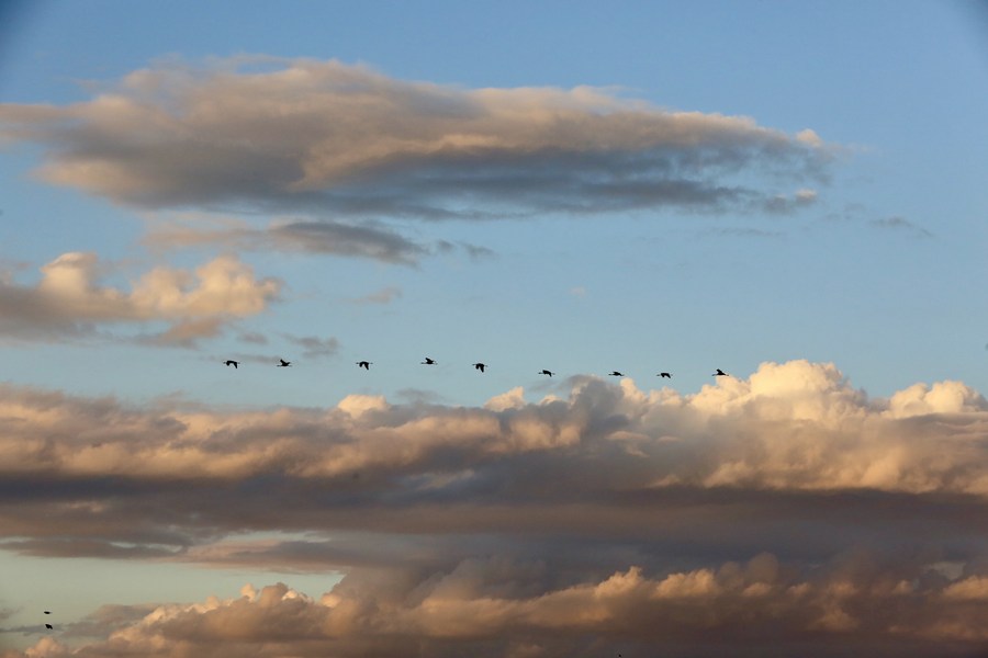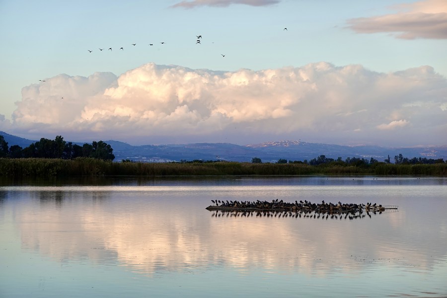 A flock of migrating birds are seen above a lake in the Hula Valley area in northern Israel, on Nov. 26, 2022. (Xinhua/Wang Zhuolun)