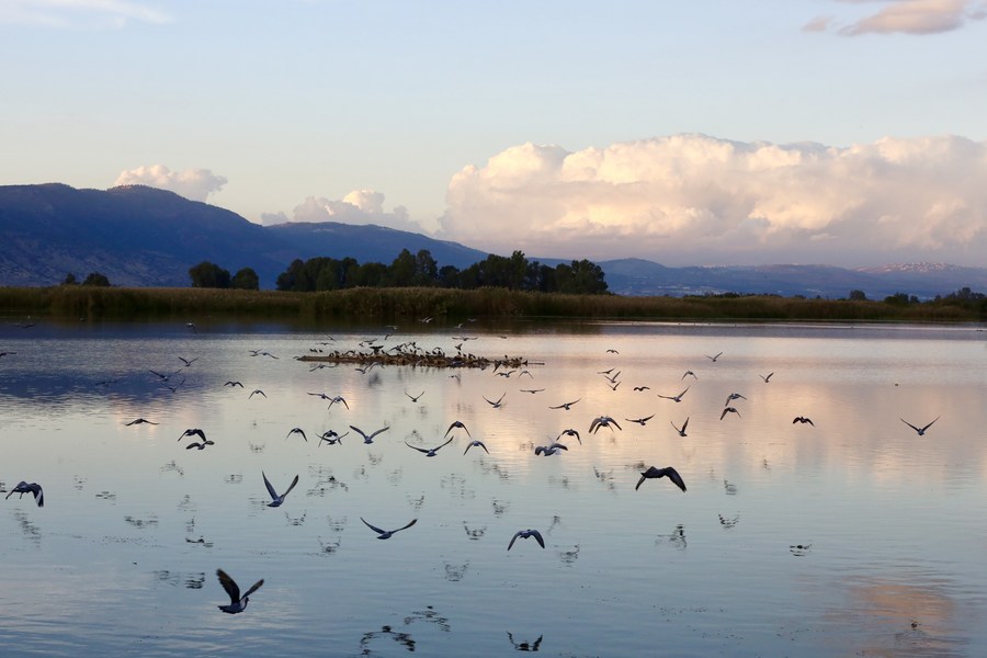 A flock of pigeons fly above a lake in the Hula Valley area in northern Israel, on Nov. 26, 2022. (Xinhua/Wang Zhuolun)■