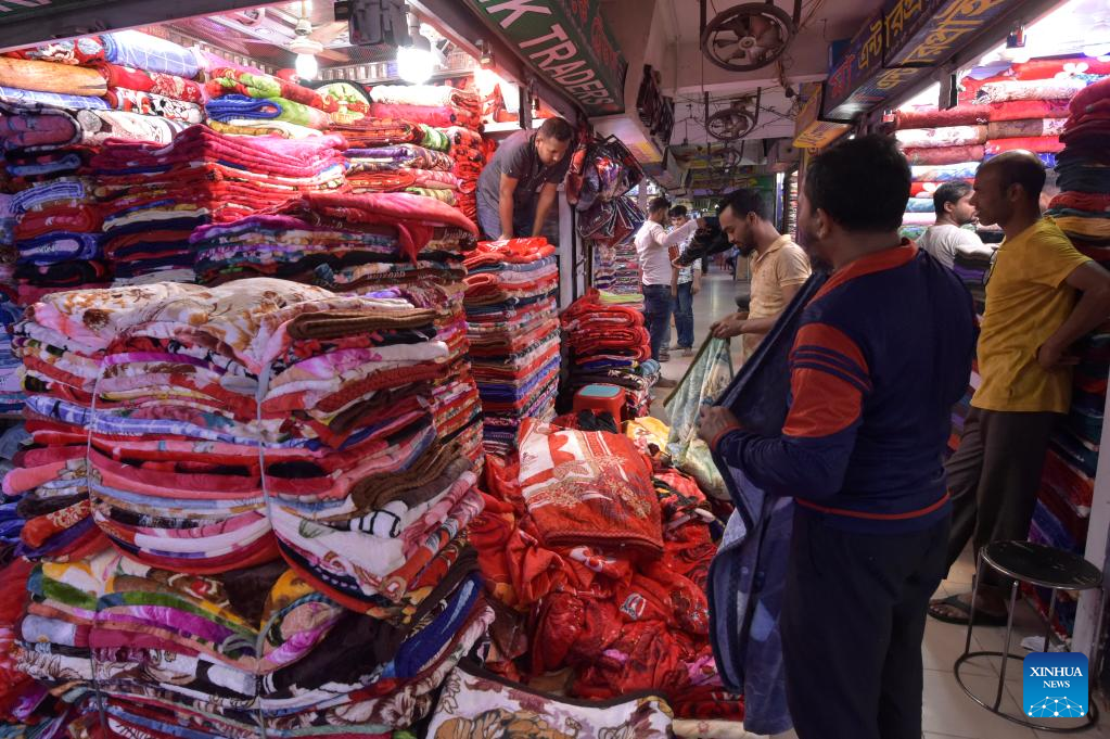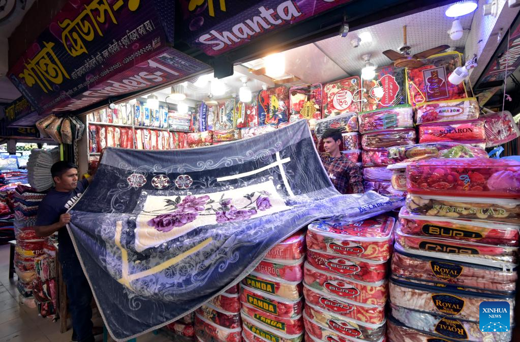 A man arranges Chinese blankets at a market in Dhaka, Bangladesh, on Nov. 23, 2022. Markets in Dhaka are now busy ahead of the peak winter sales season. Thanks to their affordability and attractive designs, readymade garment stores are now attracting many customers with ample collections of Chinese blankets. (Xinhua)
