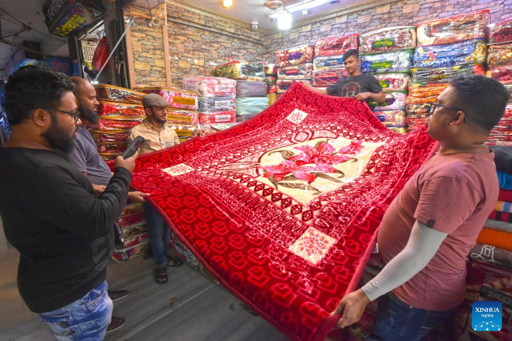 A customer visits a stand selling Chinese blankets at a market in Dhaka, Bangladesh, on Nov. 23, 2022. Markets in Dhaka are now busy ahead of the peak winter sales season. Thanks to their affordability and attractive designs, readymade garment stores are now attracting many customers with ample collections of Chinese blankets. (Xinhua)