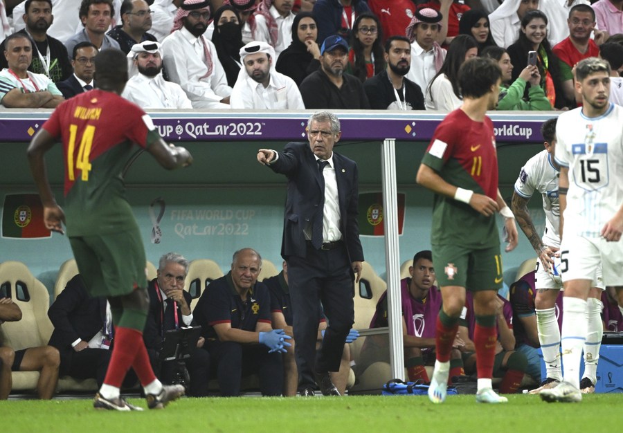 Portugal head coach Fernando Santos (2nd L), gestures to his players during their 2-0 Group H win over Uruguay at the 2022 FIFA World Cup at Lusail Stadium in Lusail, Qatar, Nov. 28, 2022. (Xinhua/Li Ga)
