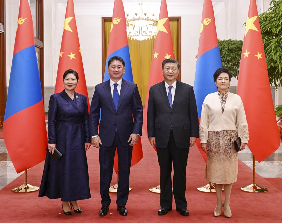 Chinese President Xi Jinping and Madame Peng Liyuan pose for a group photo with Mongolian President Ukhnaagiin Khurelsukh and his wife Bolortsetseg in Beijing, capital of China, Nov. 28, 2022. Chinese President Xi Jinping held talks with Mongolian President Ukhnaagiin Khurelsukh on Monday at the Great Hall of the People during his state visit to China. Prior to the talks, President Xi held a welcoming ceremony for President Khurelsukh in the Northern Hall of the Great Hall of the People. (Xinhua/Zhang Ling)