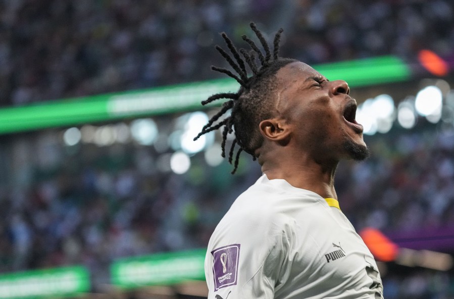 Mohammed Salisu of Ghana celebrates scoring during the Group H match between South Korea and Ghana at the 2022 FIFA World Cup at Education City Stadium in Al Rayyan, Qatar, Nov. 28, 2022. (Xinhua/Li Gang)
