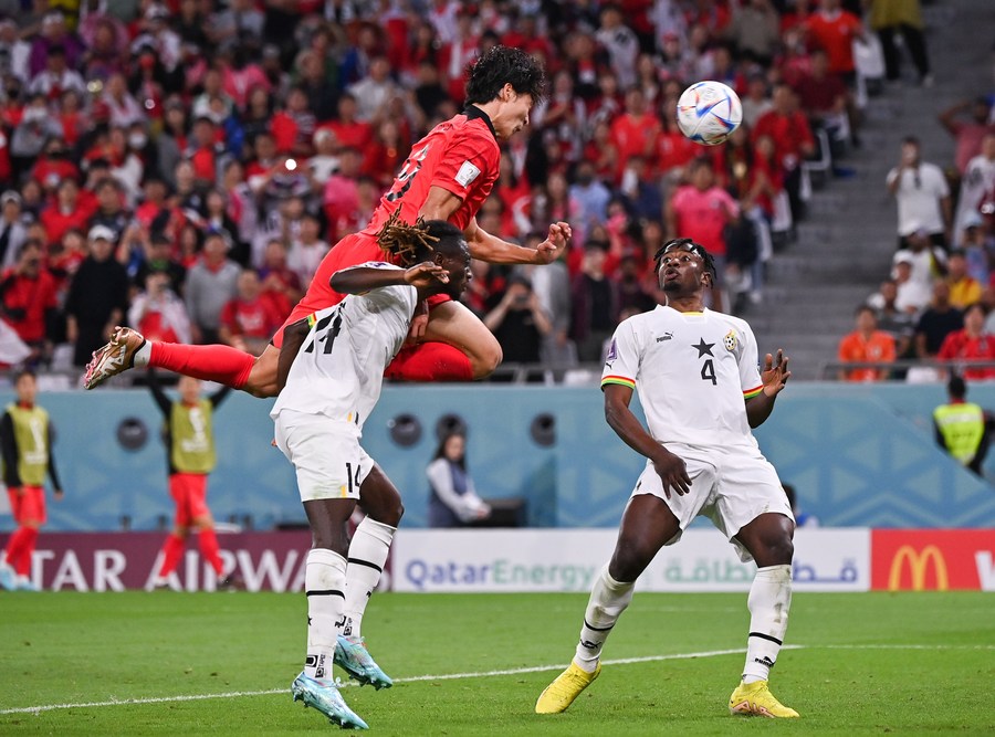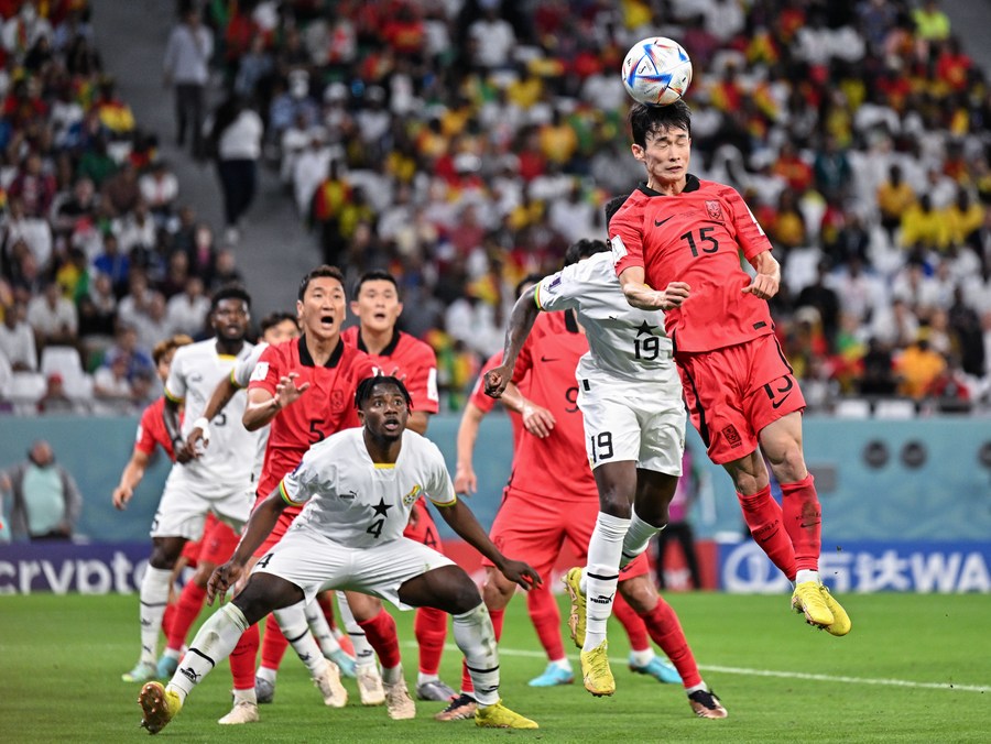 Kim Moon-hwan (1st R) of South Korea heads for the ball during the Group H match between South Korea and Ghana at the 2022 FIFA World Cup at Education City Stadium in Al Rayyan, Qatar, Nov. 28, 2022. (Xinhua/Xin Yuewei)