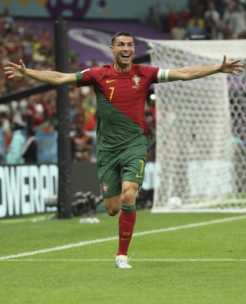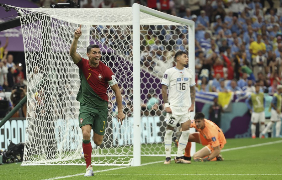 Cristiano Ronaldo of Portugal celebrates team's first goal during the Group H match between Portugal and Uruguay at the 2022 FIFA World Cup at Lusail Stadium in Lusail, Qatar, Nov. 28, 2022. (Xinhua/Han Yan)