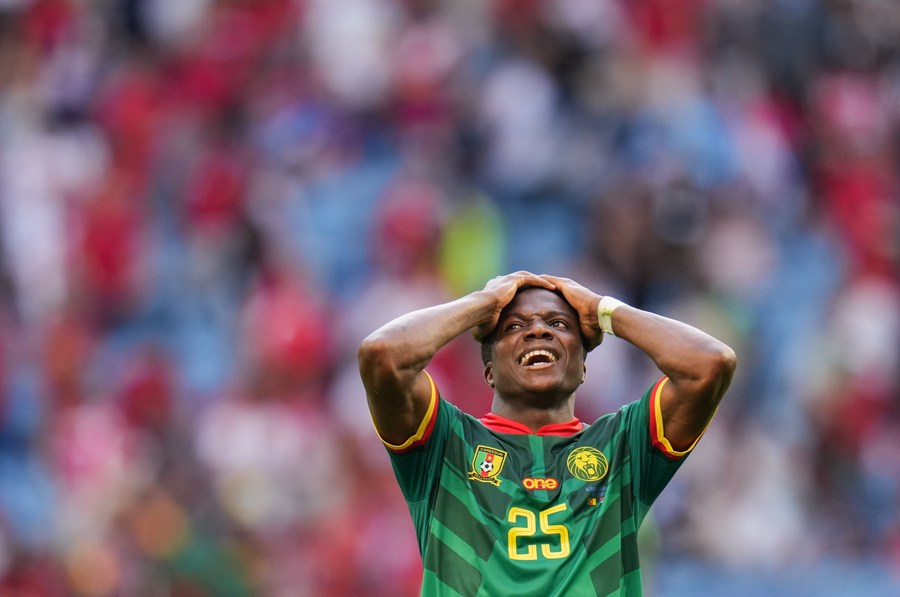 Nouhou Tolo of Cameroon reacts after the Group G match between Serbia and Cameroon at the 2022 FIFA World Cup at Al Janoub Stadium in Al Wakrah, Qatar, Nov. 28, 2022. (Xinhua/Meng Dingbo)