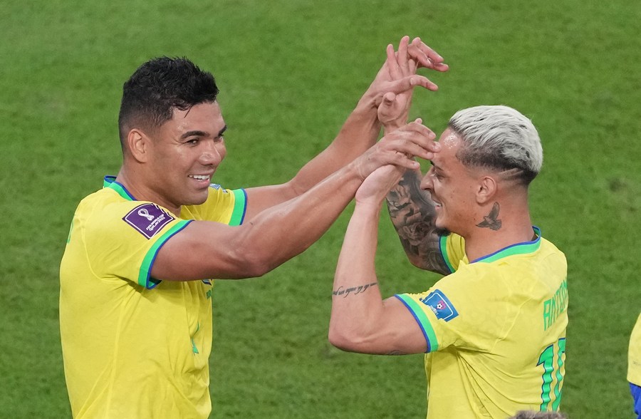 Casemiro (L) of Brazil celebrates scoring the goal with teammate Antony during the Group G match between Brazil and Switzerland at the 2022 FIFA World Cup at Ras Abu Aboud (974) Stadium in Doha, Qatar, Nov. 28, 2022. (Xinhua/Meng Yongmin)
