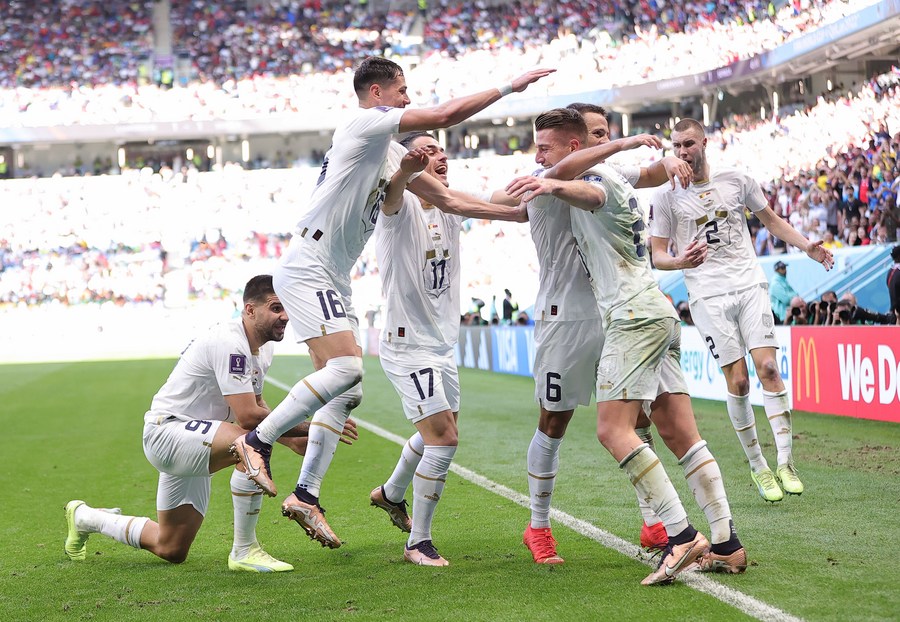 Sergej Milinkovic-Savic (1st L) of Serbia scores during the Group G match between Serbia and Cameroon at the 2022 FIFA World Cup at Al Janoub Stadium in Al Wakrah, Qatar, Nov. 28, 2022. (Xinhua/Ding Xu)