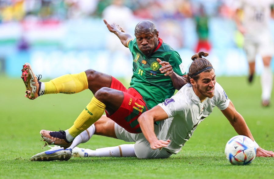 Christian Bassogog (L) of Cameroon vies with Srdjan Babic of Serbia during the Group G match between Serbia and Cameroon at the 2022 FIFA World Cup at Al Janoub Stadium in Al Wakrah, Qatar, Nov. 28, 2022. (Xinhua/Ding Xu)