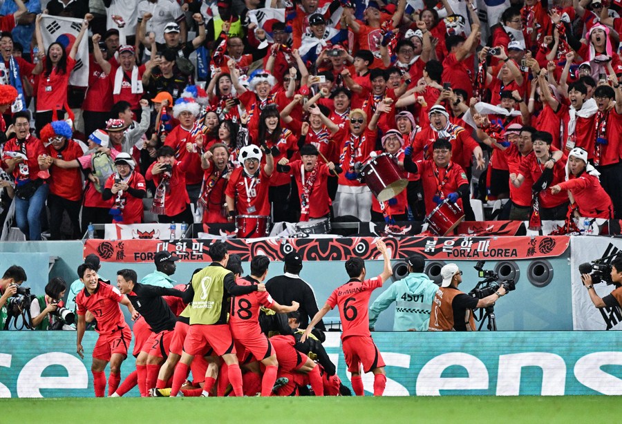 Players of South Korea celebrate scoring during the Group H match between South Korea and Ghana at the 2022 FIFA World Cup at Education City Stadium in Al Rayyan, Qatar, Nov. 28, 2022. (Xinhua/Xin Yuewei)
