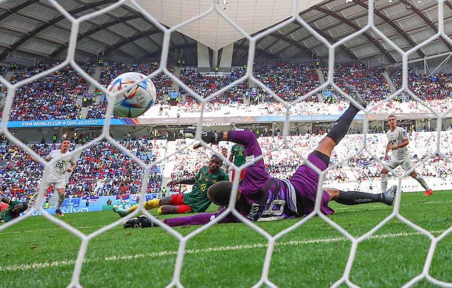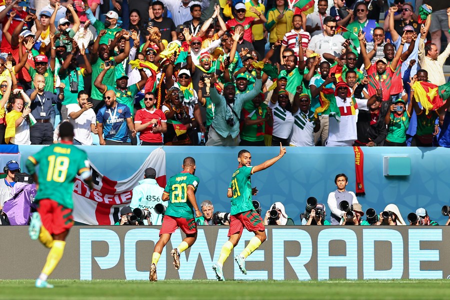 Jean-Charles Castelletto (R) of Cameroon celebrates scoring during the Group G match between Serbia and Cameroon at the 2022 FIFA World Cup at Al Janoub Stadium in Al Wakrah, Qatar, Nov. 28, 2022. (Xinhua/Ding Xu)■
