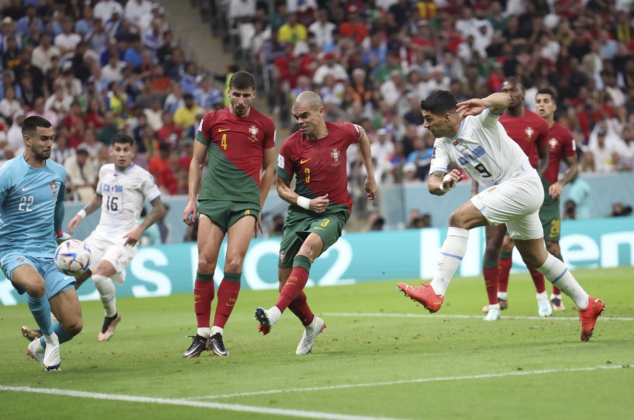 Luis Suarez (R) of Uruguay shoots during the Group H match between Portugal and Uruguay at the 2022 FIFA World Cup at Lusail Stadium in Lusail, Qatar, Nov. 28, 2022. (Xinhua/Cao Can)