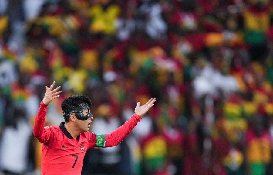 Son Heung-min of South Korea reacts during the Group H match between South Korea and Ghana at the 2022 FIFA World Cup at Education City Stadium in Al Rayyan, Qatar, Nov. 28, 2022. (Xinhua/Chen Cheng)
