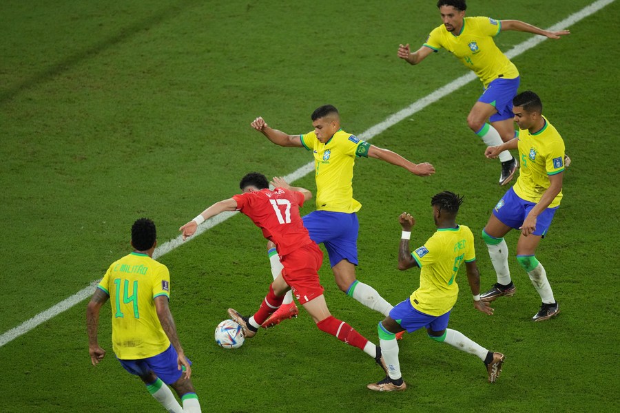 Ruben Vargas (2nd L) of Switzerland vies with Thiago Silva (3rd L) of Brazil during the Group G match between Brazil and Switzerland at the 2022 FIFA World Cup at Ras Abu Aboud (974) Stadium in Doha, Qatar, Nov. 28, 2022. (Xinhua/Zheng Huansong)