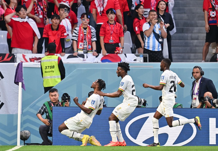 Mohammed Salisu (L) of Ghana celebrates scoring during the Group H match between South Korea and Ghana at the 2022 FIFA World Cup at Education City Stadium in Al Rayyan, Qatar, Nov. 28, 2022. (Xinhua/Xiao Yijiu)