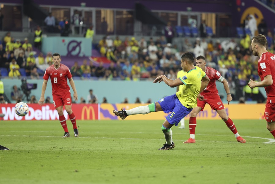 Casemiro (front) of Brazil shoots to score during the Group G match between Brazil and Switzerland at the 2022 FIFA World Cup at Ras Abu Aboud (974) Stadium in Doha, Qatar, Nov. 28, 2022. (Xinhua/Li Ming)