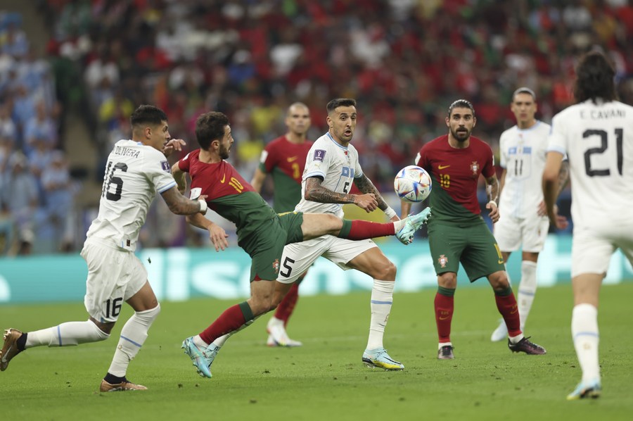 Bernardo Silva (2nd L) of Portugal vies with Matias Vecino (4th L) of Uruguay during the Group H match between Portugal and Uruguay at the 2022 FIFA World Cup at Lusail Stadium in Lusail, Qatar, Nov. 28, 2022. (Xinhua/Pan Yulong)