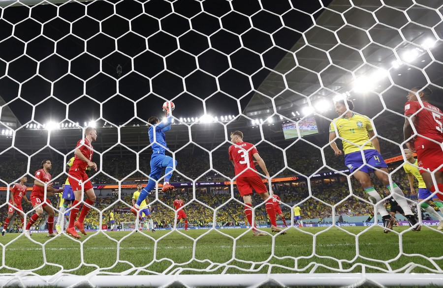 Yann Sommer (4th L, front), goalkeeper of Switzerland, makes a save during the Group G match between Brazil and Switzerland at the 2022 FIFA World Cup at Ras Abu Aboud (974) Stadium in Doha, Qatar, Nov. 28, 2022. (Xinhua/Wang Lili)