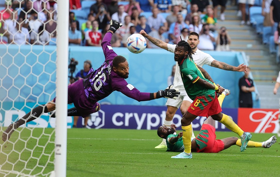 Devis Epassy (1st L), goalkeeper of Cameroon, makes a save during the Group G match between Serbia and Cameroon at the 2022 FIFA World Cup at Al Janoub Stadium in Al Wakrah, Qatar, Nov. 28, 2022. (Xinhua/Wang Dongzhen)