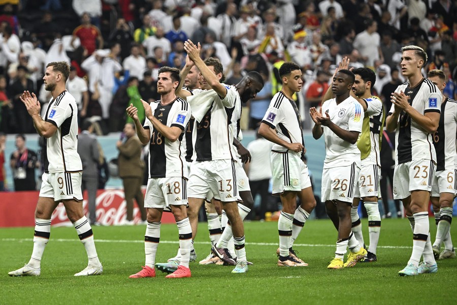 Players of Germany greet the spectators after the Group E match between Spain and Germany at the 2022 FIFA World Cup at Al Bayt Stadium in Al Khor, Qatar, Nov. 27, 2022. (Xinhua/Li Ga)