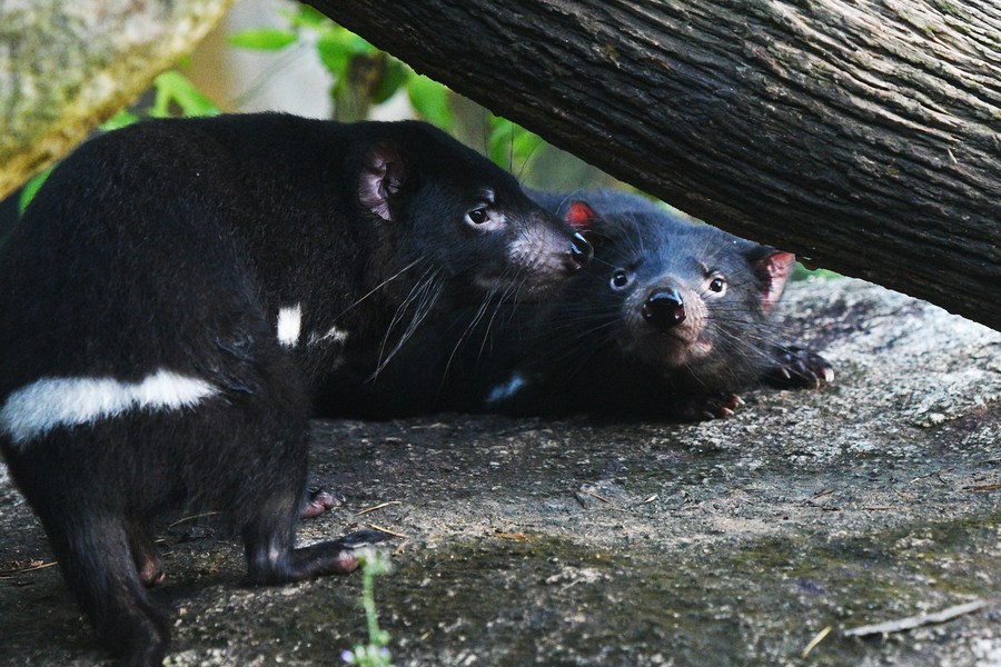 Two of the four Tasmanian Devils from Australia are seen on exhibit for the first time in Singapore's Night Safari on Nov 29, 2022. (Photo by Then Chih Wey/Xinhua)