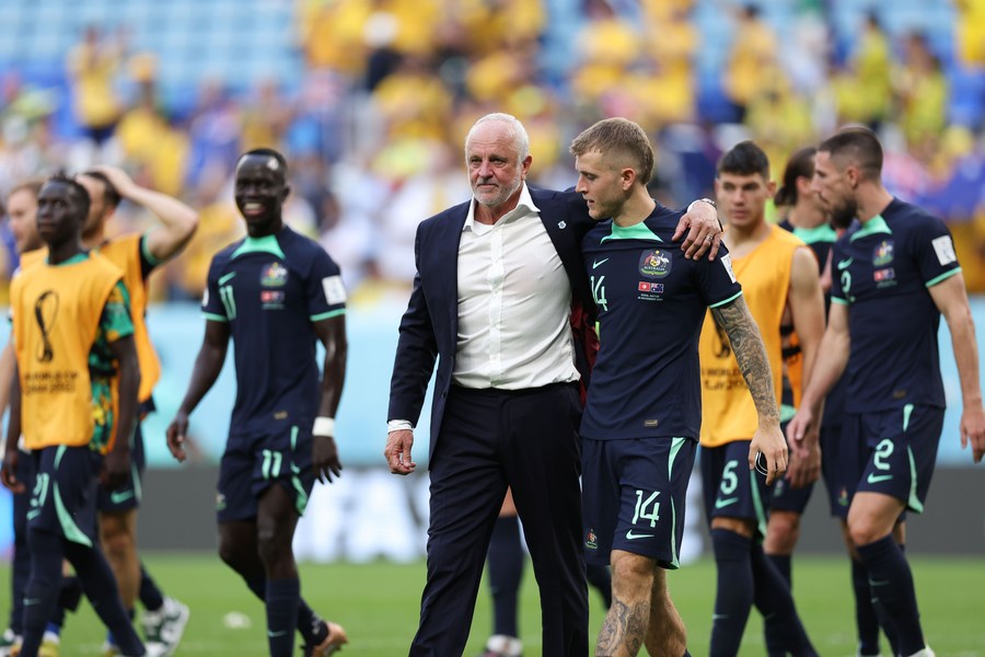 Australia head coach Graham Arnold (front L) talks to Riley McGree (front R) after their 1-0 Group D win against Tunisia at the 2022 FIFA World Cup at Al Janoub Stadium in Al Wakrah, Qatar, Nov. 26, 2022. (Xinhua/Zheng Huansong)