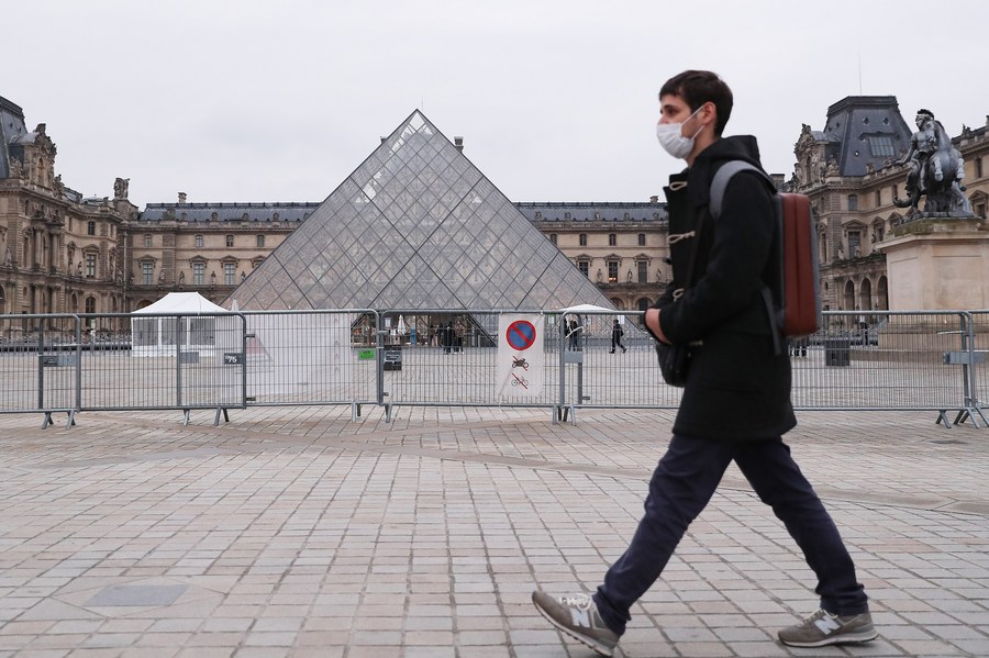 A man walks past the pyramid of Louvre Museum in Paris, France, Jan. 19, 2022. (Xinhua/Gao Jing)