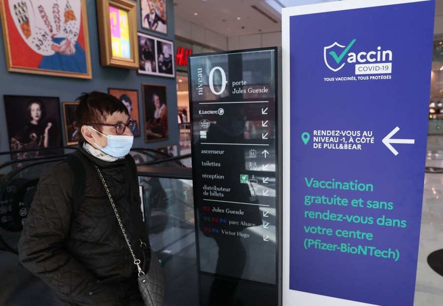 A customer walks past a sign indicating a COVID-19 vaccination center inside a shopping mall in Levallois-Perret near Paris, France, Nov. 9, 2021. (Xinhua/Gao Jing)■