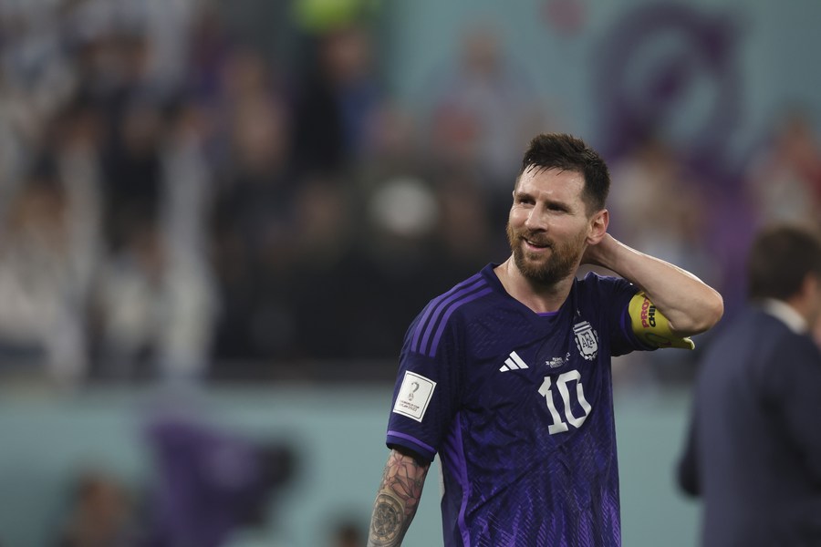 Lionel Messi of Argentina reacts after the Group C match between Poland and Argentina at the 2022 FIFA World Cup at Stadium 974 in Doha, Qatar, Nov. 30, 2022. (Xinhua/Cao Can)