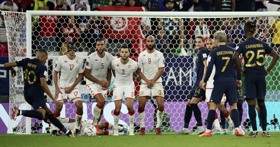 Kylian Mbappe (1st L) of France takes a free-kick during the Group D match between Tunisia and France at the 2022 FIFA World Cup at Education City Stadium in Al Rayyan, Qatar, Nov. 30, 2022. (Xinhua/Lan Hongguang)