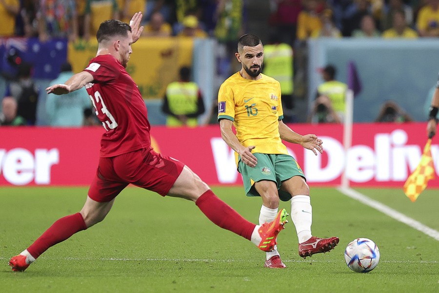 Aziz Behich (R) of Australia vies with Pierre-Emile Hojbjerg of Denmark during the Group D match between Australia and Denmark at the 2022 FIFA World Cup at Al Janoub Stadium in Al Wakrah, Qatar, Nov. 30, 2022. (Xinhua/Wang Dongzhen)