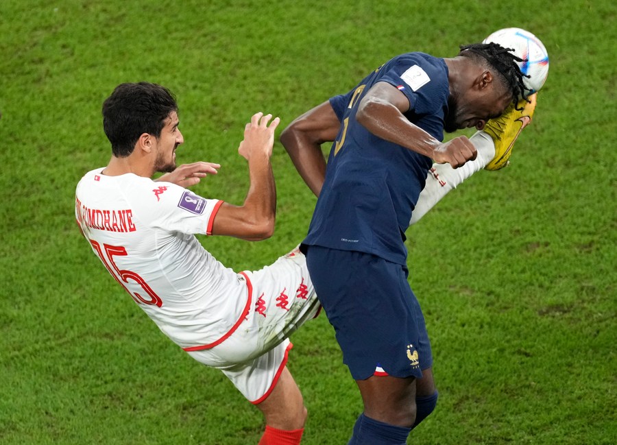 Mohamed Ali Ben Romdhane (L) of Tunisia vies with Axel Disasi of France during the Group D match at the 2022 FIFA World Cup at Education City Stadium in Al Rayyan, Qatar, Nov. 30, 2022. (Xinhua/Chen Cheng)
