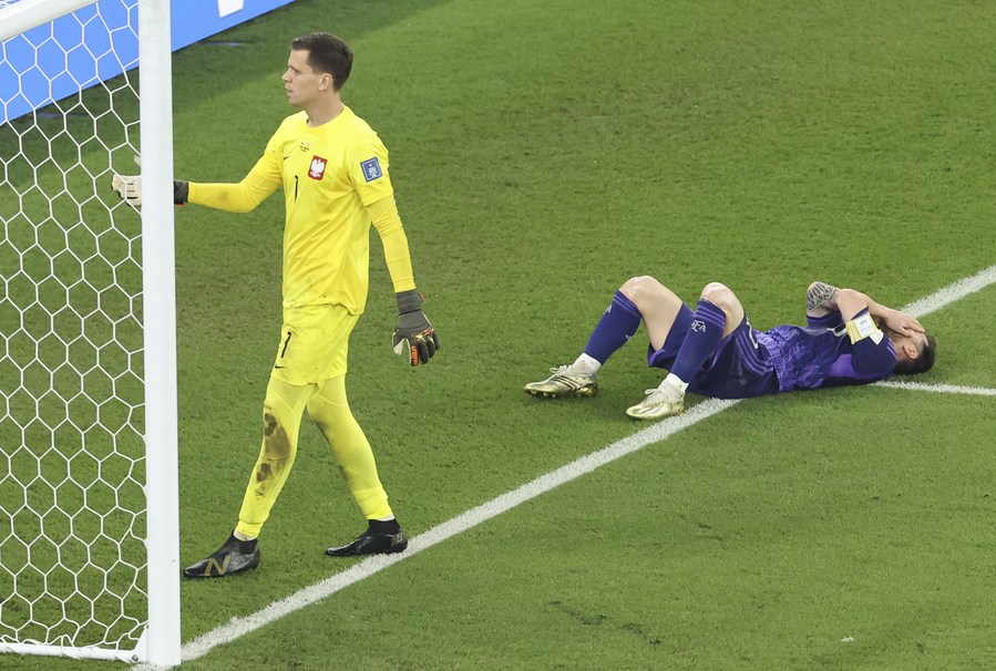 Lionel Messi of Argentina makes a penalty kick which is blocked by Poland's goalkeeper Wojciech Szczesny during the Group C match between Poland and Argentina at the 2022 FIFA World Cup at Stadium 974 in Doha, Qatar, Nov. 30, 2022. (Xinhua/Han Yan)