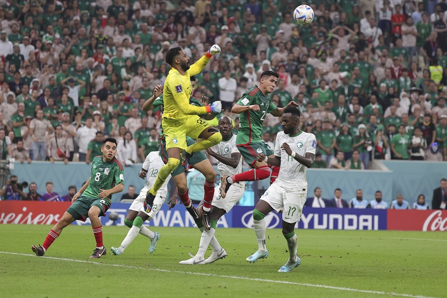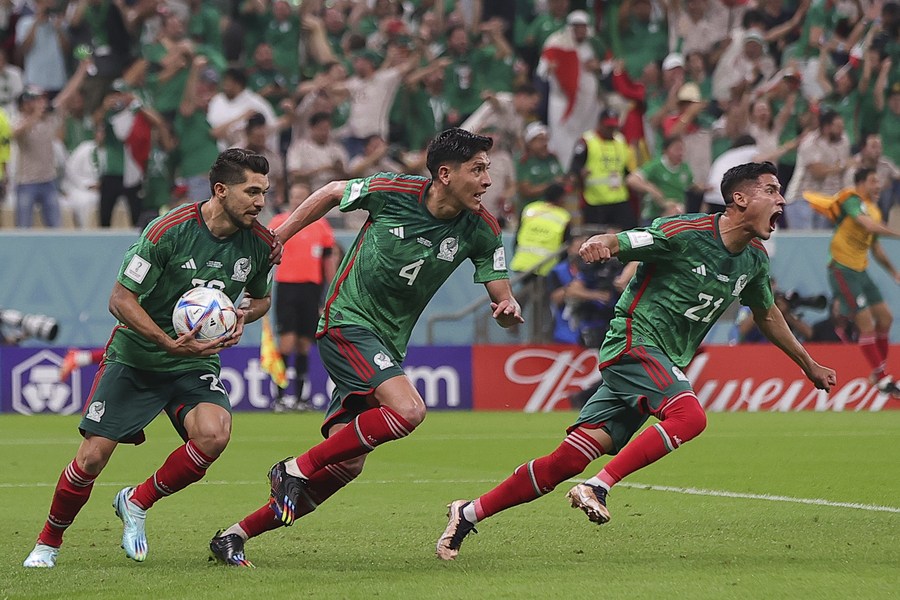 Henry Martin (2nd R) of Mexico scores during the Group C match between Saudi Arabia and Mexico at the 2022 FIFA World Cup at Lusail Stadium in Lusail, Qatar, Nov. 30, 2022. (Xinhua/Wang Dongzhen)■