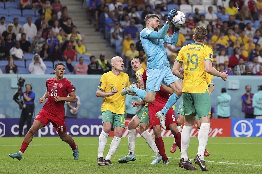 Mathew Ryan (Top), goalkeeper of Australia, makes a save during the Group D match between Australia and Denmark at the 2022 FIFA World Cup at Al Janoub Stadium in Al Wakrah, Qatar, Nov. 30, 2022. (Xinhua/Wang Dongzhen)