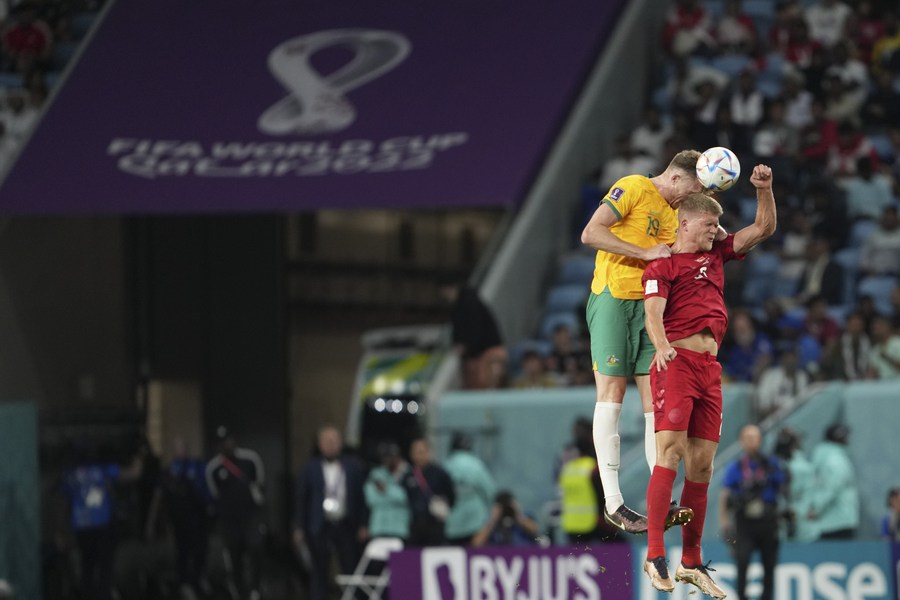 Harry Souttar (L) of Australia heads the ball during the Group D match between Australia and Denmark at the 2022 FIFA World Cup at Al Janoub Stadium in Al Wakrah, Qatar, Nov. 30, 2022. (Xinhua/Zheng Huansong)