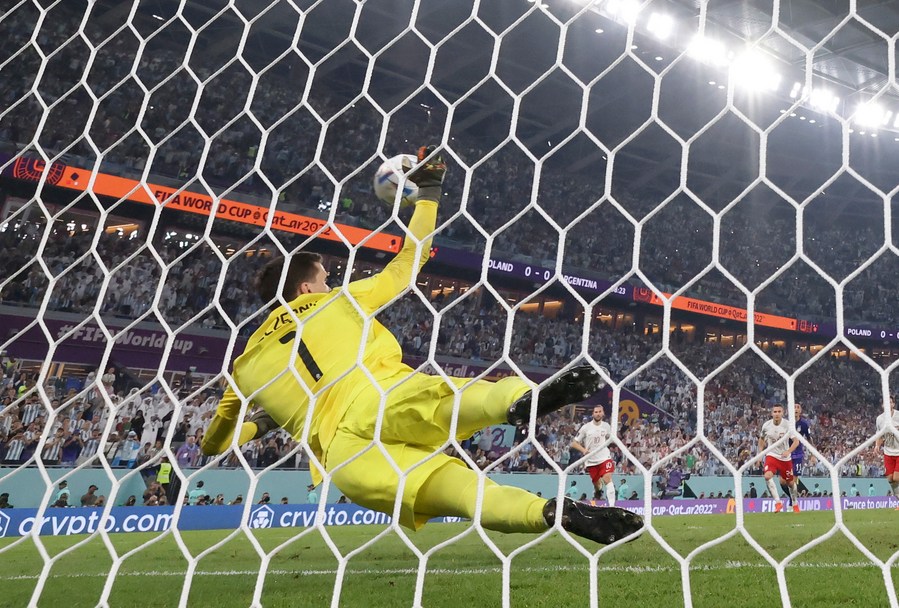 Wojciech Szczesny (front), goalkeeper of Poland, blocks a penalty kick by Lionel Messi of Argentina during their Group C match at the 2022 FIFA World Cup at Stadium 974 in Doha, Qatar, Nov. 30, 2022. (Xinhua/Cao Can)