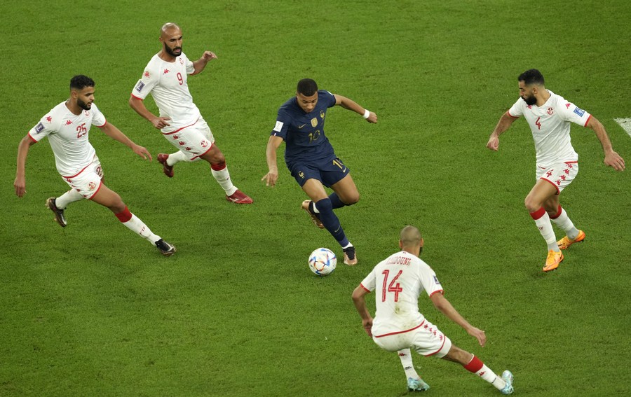 Kylian Mbappe (C) of France controls the ball during the Group D match between Tunisia and France at the 2022 FIFA World Cup at Education City Stadium in Al Rayyan, Qatar, Nov. 30, 2022. (Xinhua/Xiao Yijiu)