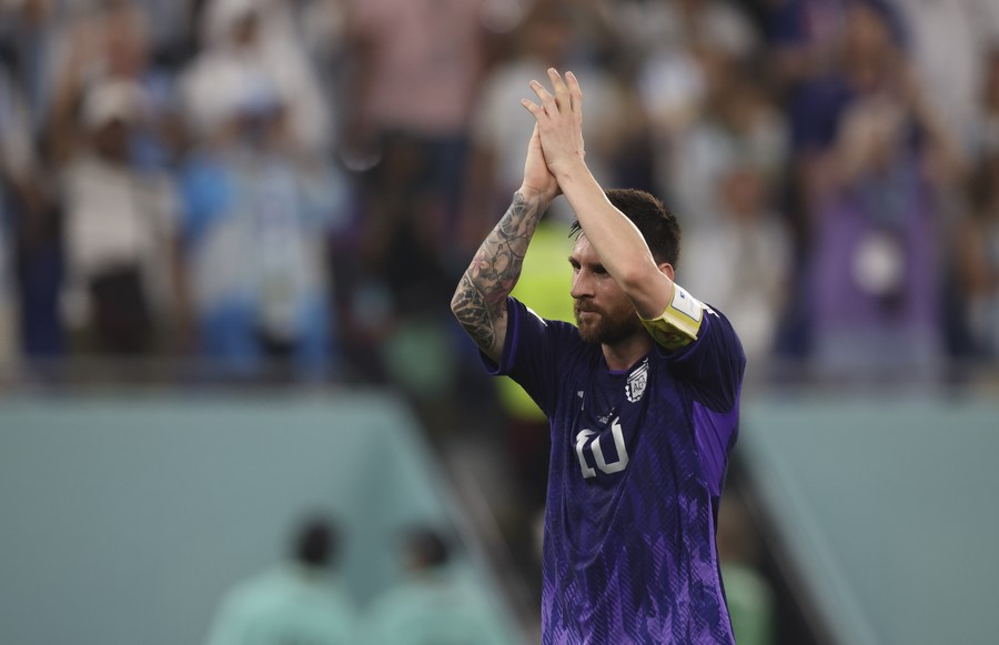 Lionel Messi of Argentina reacts after the Group C match between Poland and Argentina at the 2022 FIFA World Cup at Stadium 974 in Doha, Qatar, Nov. 30, 2022. (Xinhua/Cao Can)