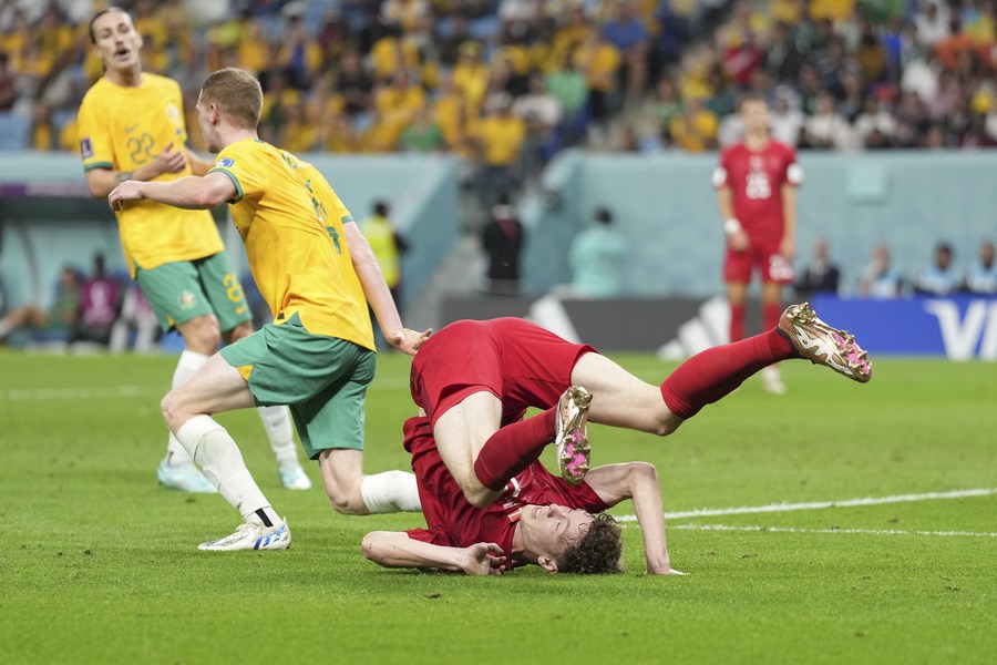Andreas Skov Olsen (Bottom) of Denmark falls during the Group D match between Australia and Denmark at the 2022 FIFA World Cup at Al Janoub Stadium in Al Wakrah, Qatar, Nov. 30, 2022. (Xinhua/Zheng Huansong)