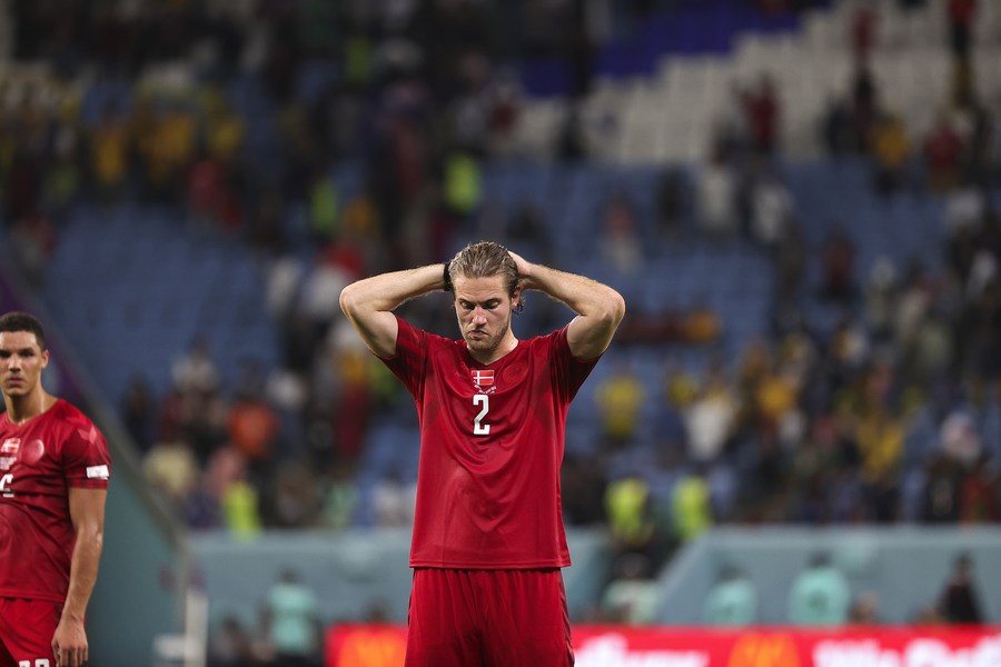 Christian Eriksen of Denmark reacts after the Group D match between Australia and Denmark at the 2022 FIFA World Cup at Al Janoub Stadium in Al Wakrah, Qatar, Nov. 30, 2022. (Xinhua/Wang Dongzhen)