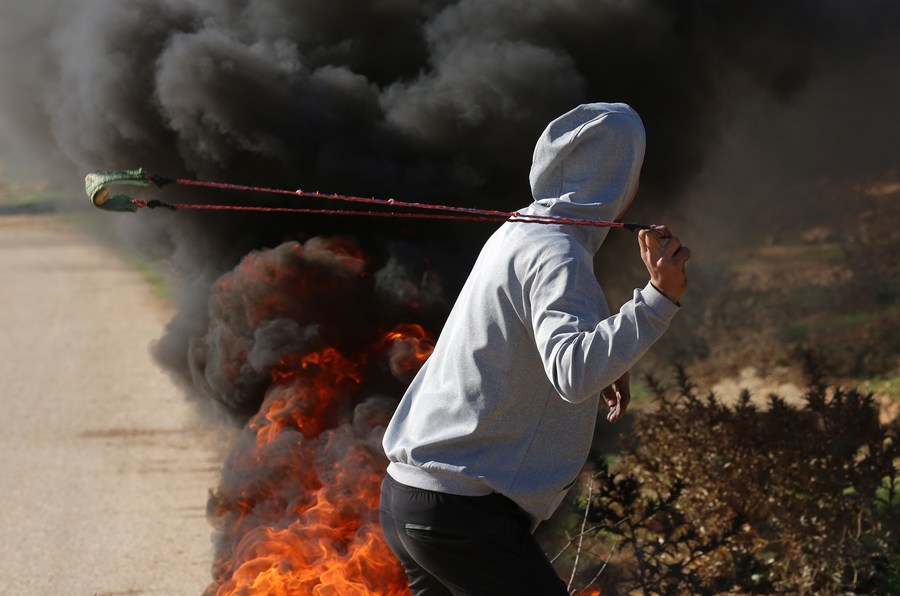 A Palestinian protester uses a slingshot to hurl a stone during clashes with Israeli soldiers following a protest against the expansion of Jewish settlements in the West Bank village of Beit Dajan, east of Nablus, Dec. 2, 2022. (Photo by Nidal Eshtayeh/Xinhua)